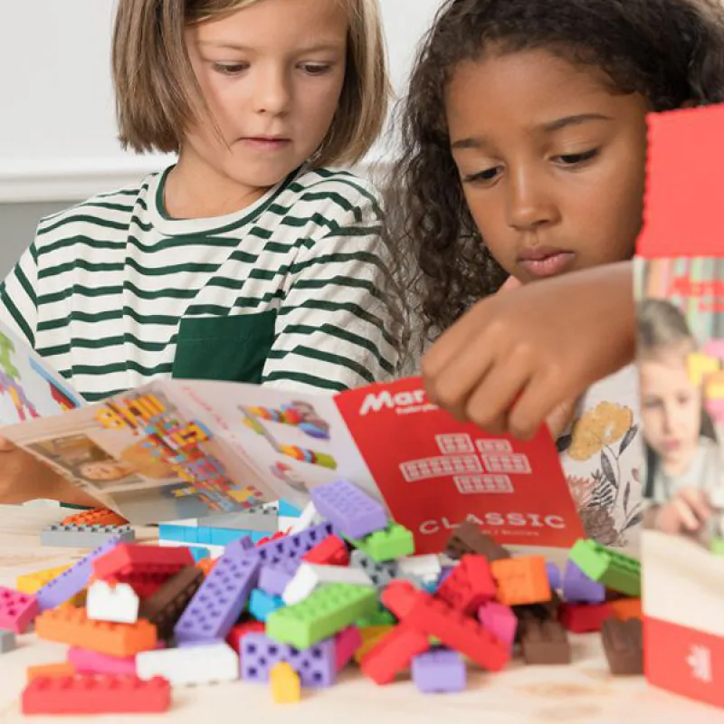 Die Marioinex classic-Blöcke sind aus weichem, flexiblem Material hergestellt, wodurch sie angenehm, sicher und leise zu spielen sind. Die klassischen Blöcke haben eine einfache Struktur von Einsätzen und Löchern und man kann sie auf viele verschiedene Arten verbinden.